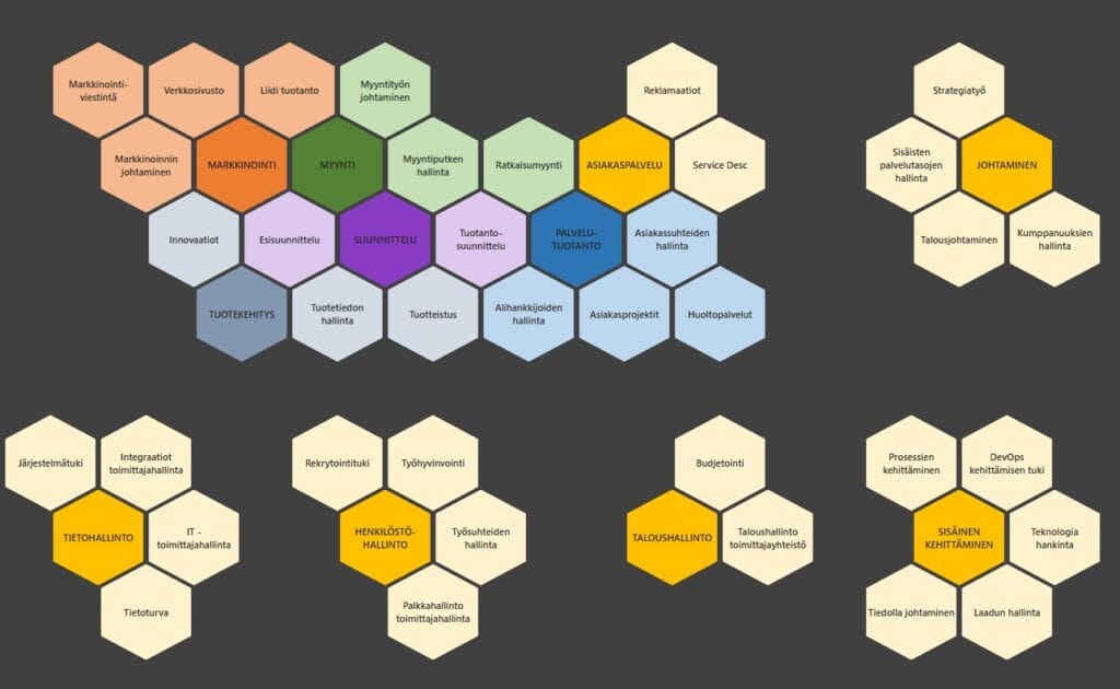 Tämän kokonaisuuden havainnollistamiseksi on käytetty kyvykkyyskarttaa, jossa on kuvattu, millaisia valmiuksia yrityksen tulee hallita menestyäkseen. Kartta jakaa toiminnan kolmeen osa-alueeseen: johtaminen, ydinprosessit ja tukiprosessit.